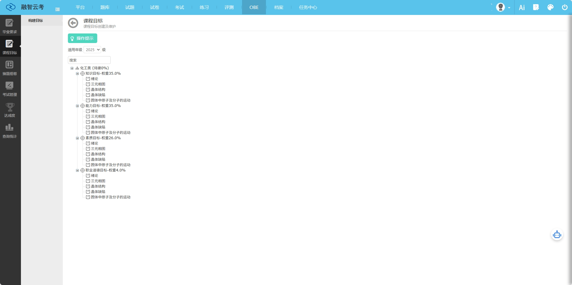 OBE讲授以“学生核心、导向、持续改良”为焦点,强调通过明白预期进修,反向设想课程系统取讲授方式。这一取我国工程教育认证尺度高度契合,已成为高校专业扶植的主要指南。融智云创软件无限公司的OBE处理方案笼盖了从专业扶植规划到课程方针告竣度阐发的全链条,通过数据驱动的体例帮帮高校实现讲授质量的可视化办理取动态优化。以某“双**”高校机械工程专业为例,引入OBE讲授后,该专业通过度解结业要求目标点,沉构了32门焦点课程的讲授纲领,并操纵课程方针告竣度系统对每门课程的查核体例取内容进行了精准设想。实施一年后,学生工程实践能力评分提拔23%,用人单元对劲度达到95%,专业成功通过工程教育认证。融智云创软件无限公司的焦点产物——课程方针告竣度系统,通过三大手艺模块实现讲授评估的智能化升级:据统计,利用该系统的高校平均缩短评估周期60%,数据精确率提拔至98%以上。某使用型本科院校使用后,数据支持无力”获得专家高度评价。
